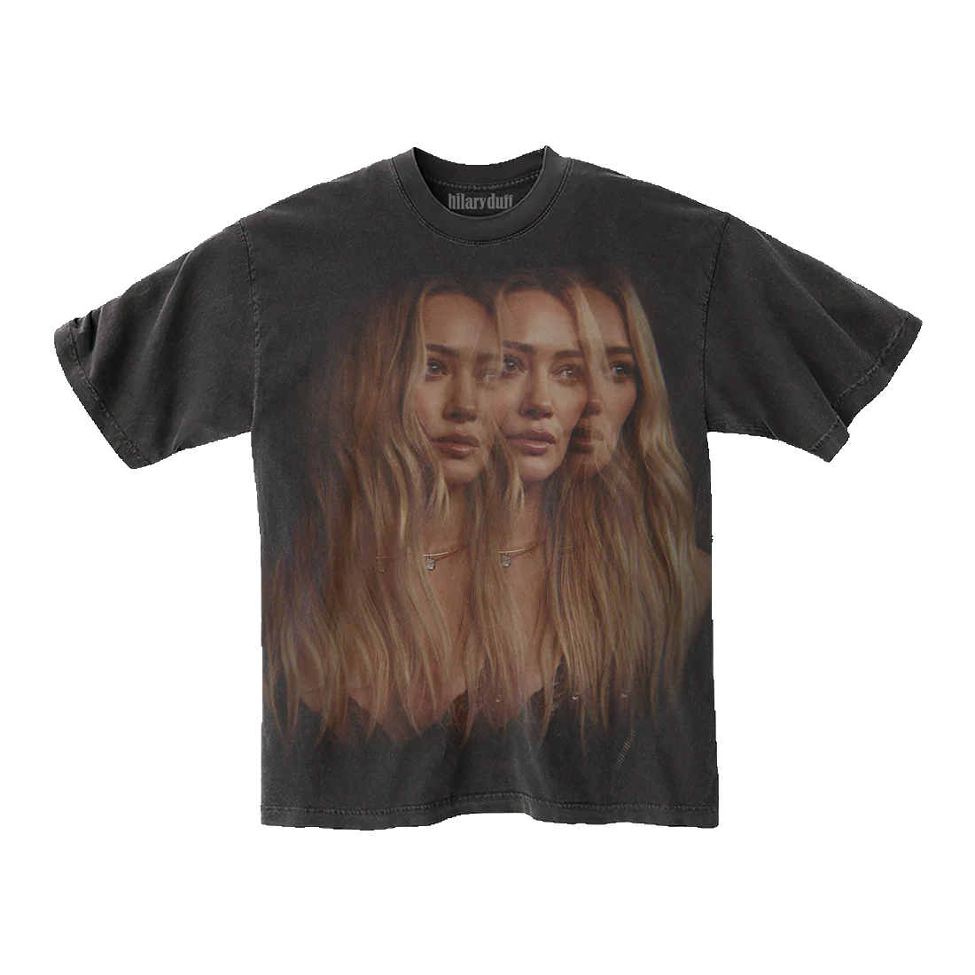 This tee is printed on a black 100% cotton heavyweight garment dyed tee. Features a photo of Hilary on the front and the Hilary Duff logo on the back.