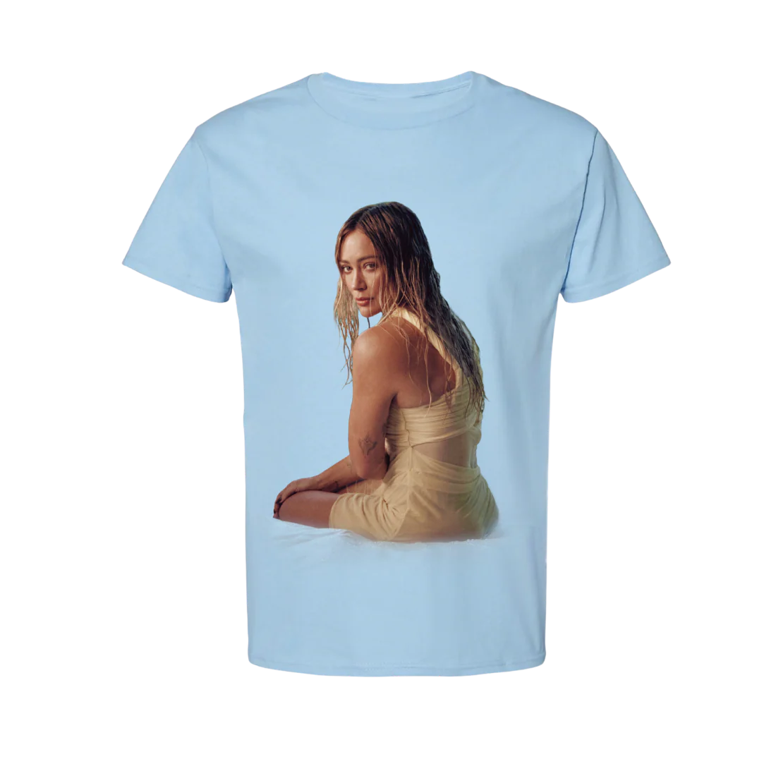 Light blue tee featuring a photo of Hilary on the front and her name on the back. 100% cotton tee.
